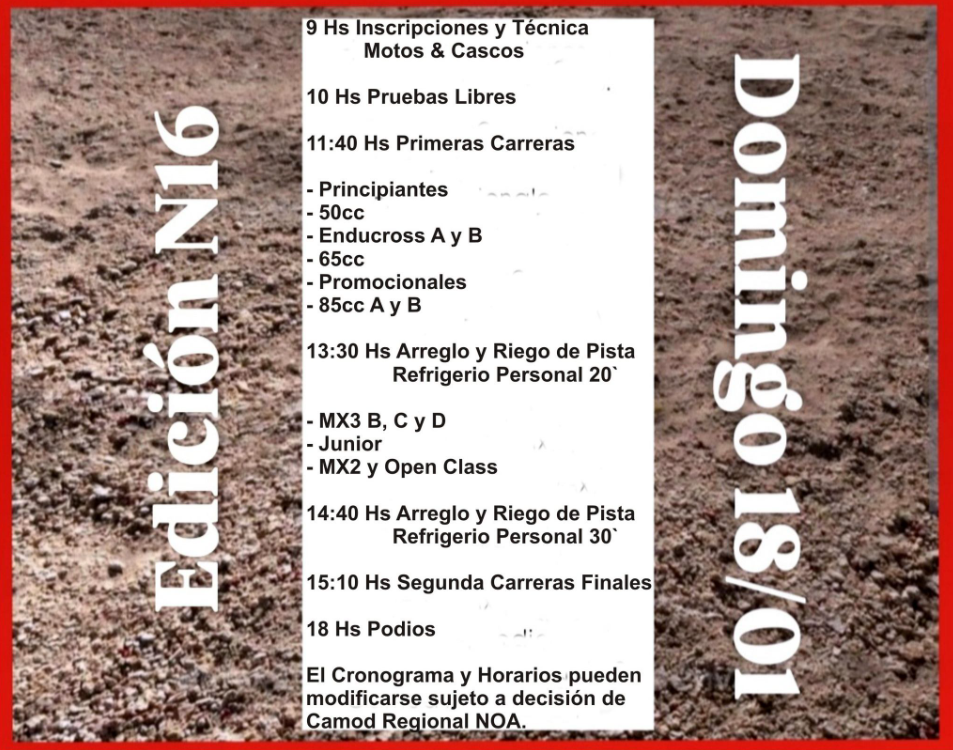 En efecto, la fecha 1 está prevista entre el sábado 17 y el domingo 18 de enero, en el circuito de la zona de Ojo de Agua. La fecha 2, a su vez, fue programada para el 14 y 15 de febrero. La fiscalización será de la Camod Regional NOA.