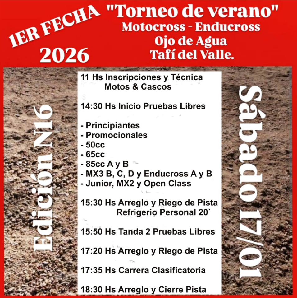 Para quienes ya esperan ansiosos el comienzo de la acción en este 2026, en pocos días habrá un “aperitivo” de calidad en Tafí del Valle, centro de la acción del ya tradicional Torneo de Verano de motocross y enducross, que tendrá su edición N°16.
