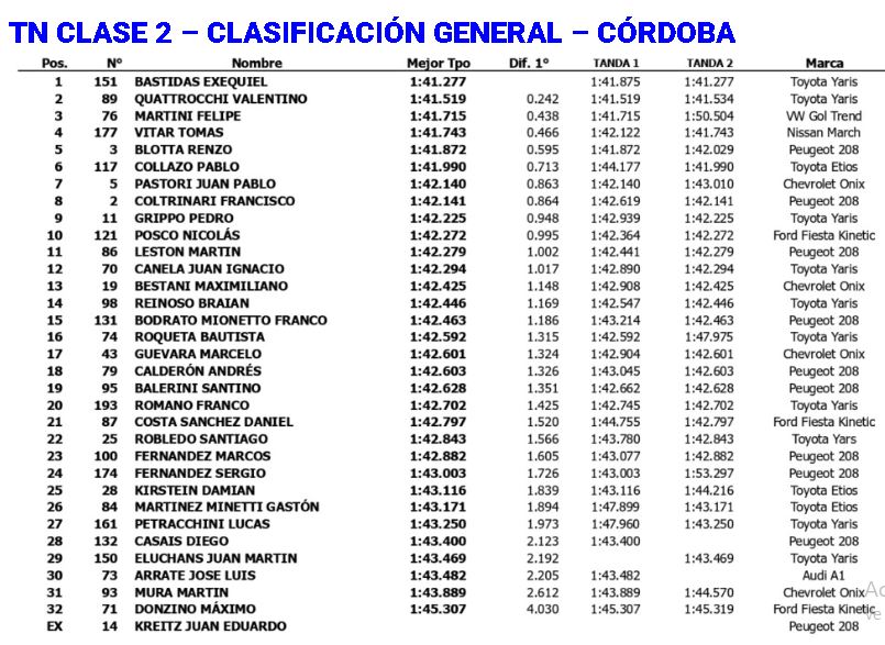 Maximiliano Bestani, con un Chevrolet Onix del equipo JMP Racing, se ubicó en el puesto 13, mientras que Braian Reinoso, con un Toyota Yaris del equipo Giacone Competición, quedó en la 14ª posición.