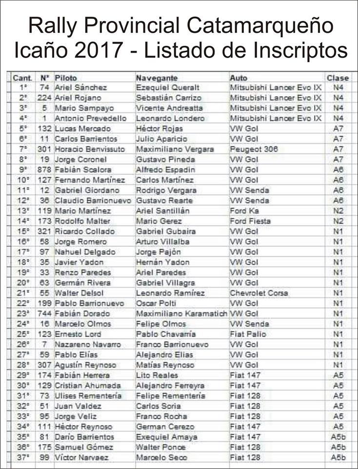 Fabián Scalora (en dupla con Alfredo Espadín), en un VW Gol A-6; Ricardo Collado (con Gabriel Gubaira) en un Gol N-1, Pablo Elías (con su hermano Alejandro Elías) en un Gol N-1 y Ernesto Lord (con Pablo Chavarría) en un Fiat Palio N-1 serán los pilotos tucumanos en acción. Entre los navegantes, se anota el concepcionense Maximiliano Karamatich, que acompañará al local Fabián Dorado, en un Gol de la N-1. La lista completa de inscriptos es esta: