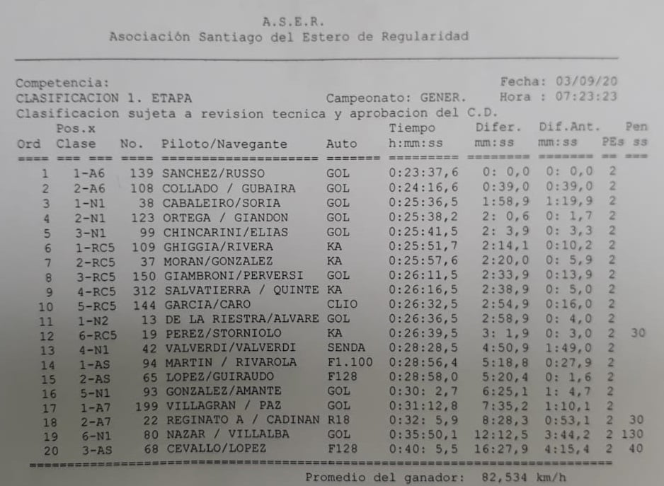 Esta situación generó que la clasificación sufra una demora en su confección. Sucede que los comisarios deportivos no se pudieron reunir, dado el contratiempo de Almonte. A ello se sumó un inconveniente mecánico que sufrió la camioneta que trasladaba el equipo de cronometraje de Santiago del Estero.