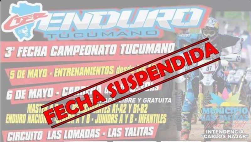 Mediante un comunicado, el CTER informó que quedó suspendida la tercera fecha del Campeonato Tucumano de Enduro, la cual estaba programada para este domingo en el circuito de Las Lomadas, en Las Talitas. La medida se debe a las inclemencias climáticas de las últimas horas, razón por la cual los accesos al circuito están muy complicados, por lo que será incómodo recibir a los pilotos y al público. La competencia será reprogramada y anunciada oportunamente.