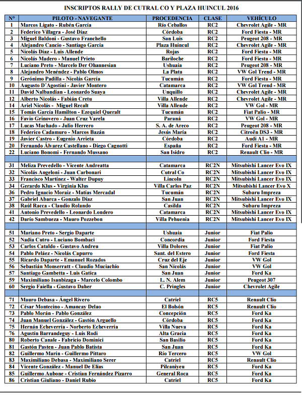 Entre los 51 inscriptos (ver lista completa en imagen dos) para participar el fin de semana del Rally de Cutral Co y Plaza Huincul (Neuquén), segunda del Campeonato Argentino, figuran cuatro pilotos tucumanos, los mismos que ya estuvieron en Carlos Paz: Gerónimo Padilla, Tomás García Hamilton (ambos en Maxi Rally); Pedro Moraiz -h- (en RC2N) y Pablo Morán (R5N). A ellos se agrega Pablo González, navegante de este último.