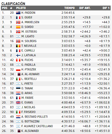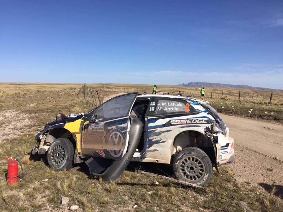 La carrera es ganada ahora por el neozelandés Hayden Paddon (Hyundai), que reúne un tiempo de 2hs.54’45″6/10. Sigue 2° el francés Sébastien Ogier (VW Polo), a 29″8710 y el nuevo tercero es el noruego Andreas Mikkelsen (VW Polo), a 44″3/10. El finés Jari-Matti Latvala (VW Polo) tuvo un serio problema: en el tramo Los Gigantes-Cantera El Cóndor, cuando enseñaba el camino, se salió del camino en el kilómetros 21 y abandonó. Espectadores apostados en el lugar informaron que el nórdico dio tres vueltas en el aire con su coche y volcó (foto).