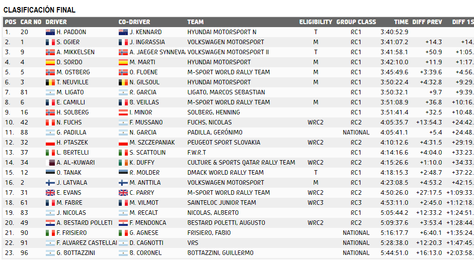 Paddon, además, accedió al segundo lugar en la tabla de posiciones del certamen, ya que con 57 unidades es escolta de Ogier, quien manda con 96.