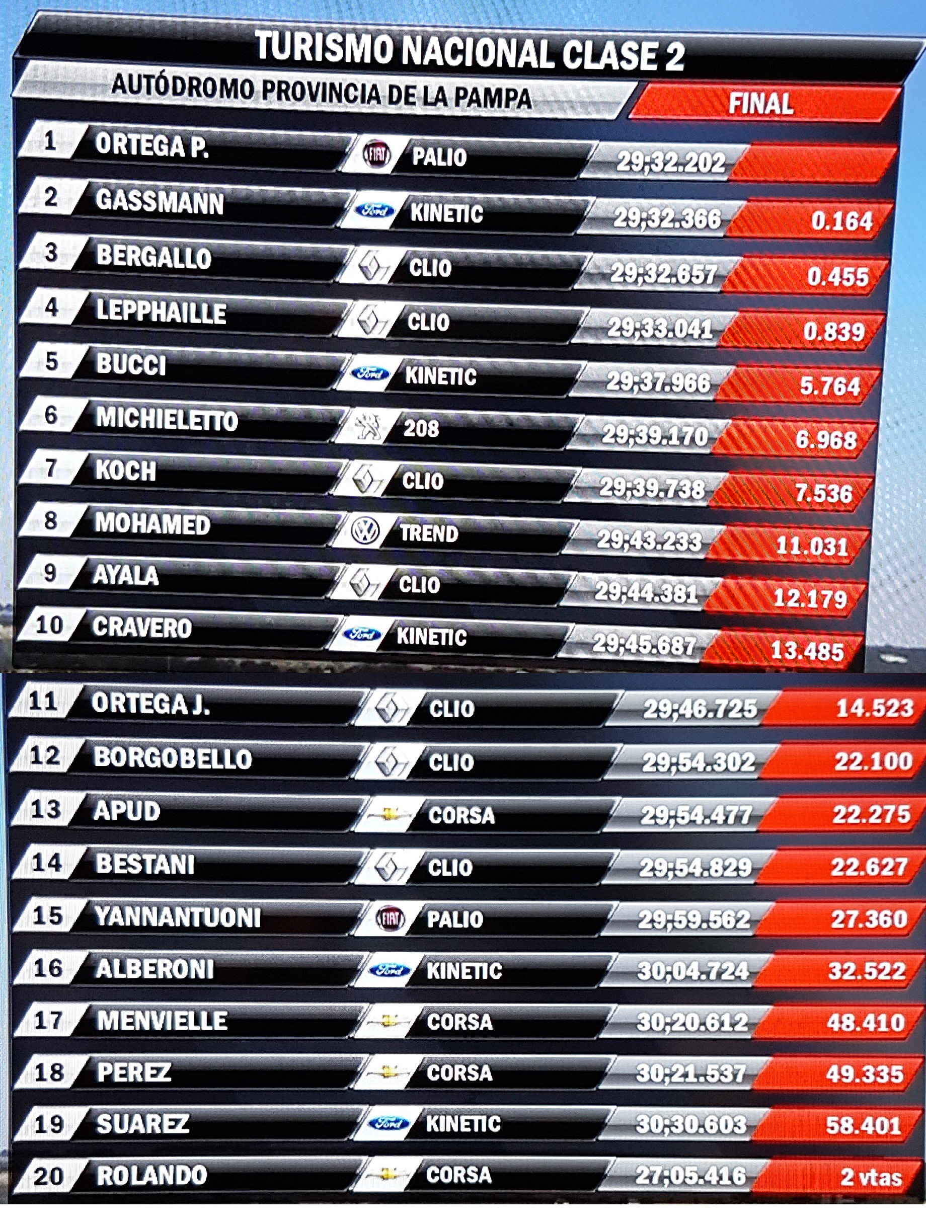 “Pabloso” brilló con luz propia. Y los otros tucumanos también mostraron lo suyo: Lucas Mohamed (con VW Gol Trend) volvió a la categoría y finalizó fue 8°, luego de largar 14°; Juan Ortega (Renault Clio) fue 11°, tras sufrir el fragor de la lucha, y Maximiliano Bestani (Clio) culminó 14°, cuando había partido 25°.