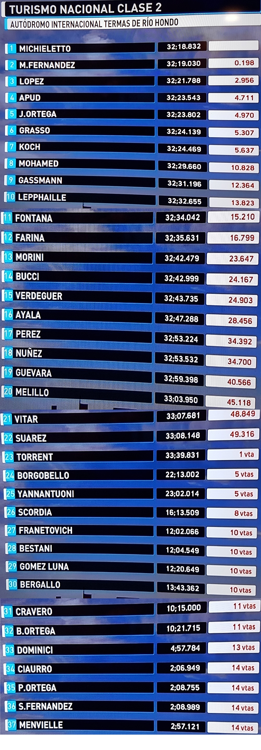 En el campeonato, sigue mandando Alejandro Bucci (Ford), ahora con 101 puntos, seguido por Pablo Ortega, con 91. El nuevo tercero es Juan Ortega, con 74. Lucas Mohamed escaló hasta el puesto 16, con 32 y Maximiliano Bestani quedó 17°, con 31.
