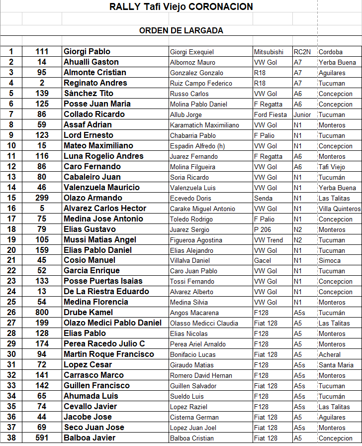 La lista completa de inscriptos, así como el orden de salida, es el siguiente: