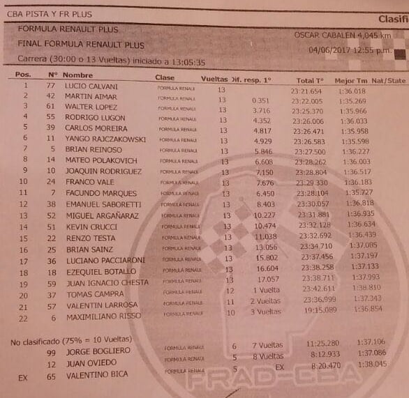 Carlos Moreira Gibilisco finalizó 5°. Había largado 4°; llegó a pelear el 2° puesto; viajó un largo rato 3°, luego del ingreso del auto de seguridad fue por más, pero se vio involucrado en una acción friccionada que lo llevó al pasto; se retrasó y en los giros finales pudo recuperar puestos. Con su trabajo, se mantiene en lo alto de la lucha por el primer lugar del certamen. “Quedé con bronca por el toque de Facundo Marques. Estaba para terminar más adelante”, dijo “Carlín”.