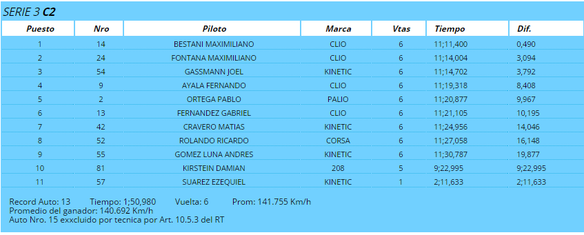 Final de competencia: mucho trabajo en el área de comisariato deportivo. Sanciones por lo sucedido en pista y al cabo de la verificación técnica. La clasificación sufre modificaciones, es más, se mueve el tablero de las series del día anterior. E incluso se toman medidas con vistas a la fecha de Las Termas. Y Bestani apareció en el informe final: “exclusión auto N° 14 más 12 grillas próximo evento por maniobra peligrosa al auto N°8 y por no respetar señalización” se pudo leer.