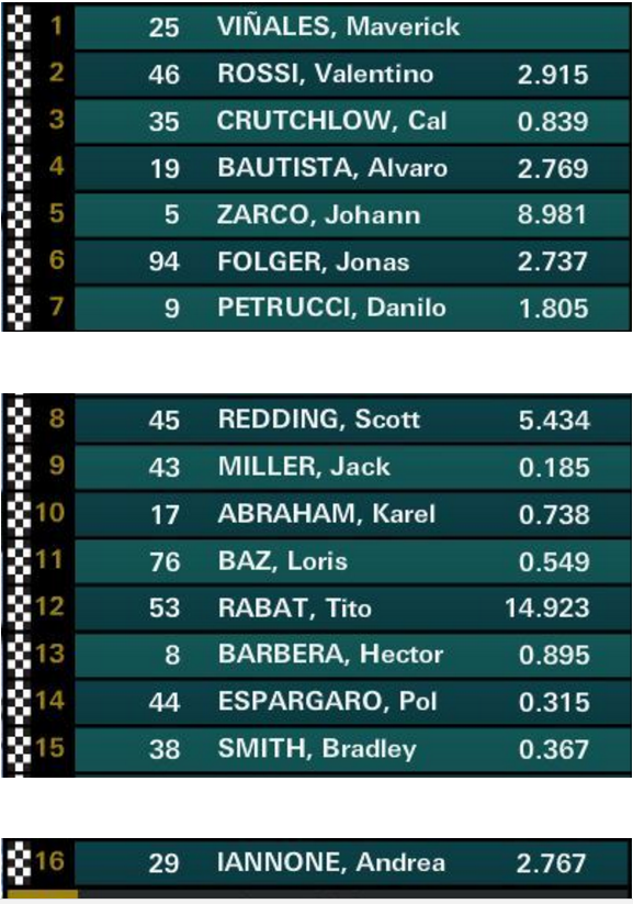 Con dos carreras, Viñales lidera el certamen con 50 puntos; lo siguen Rossi (36) y Andrea Dovizioso (20). En Constructores, Yamaha manda con 50 unidades, seguido por Ducati (33) y Honda (29).