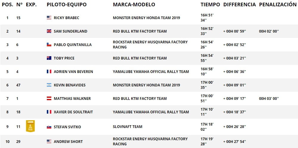 De esta manera, Sunderland, que ganó la edición 2017 del rally, se adjudicó su primer tramo en este Dakar, quinto en toda su trayectoria deportiva en la competencia, y ascendió al segundo lugar de la general, a 59 segundos del estadounidense Ricky Brabec (Honda), quien culminó 11° en la jornada.