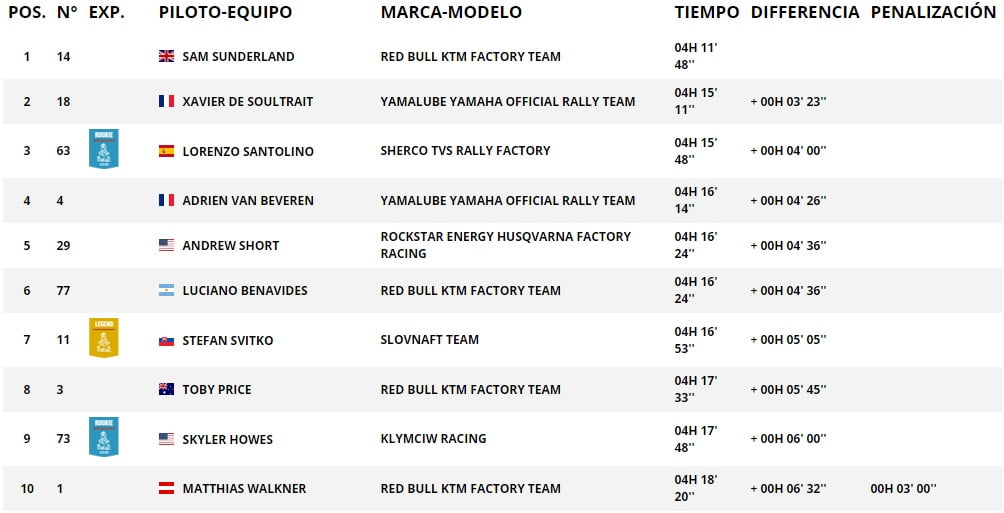 Entre los argentinos, Luciano Benavídes (KTM) llevó a cabo su mejor tarea hasta el momento y terminó 6°, a 4m36 de Sunderland. Sin embargo, el hermano del salteño, Kevin (12° con la Honda), continúa siendo el mejor representante nacional en la tabla de tiempos totales, en la que se encuentra en el puesto 6, a 9m01s del primero.