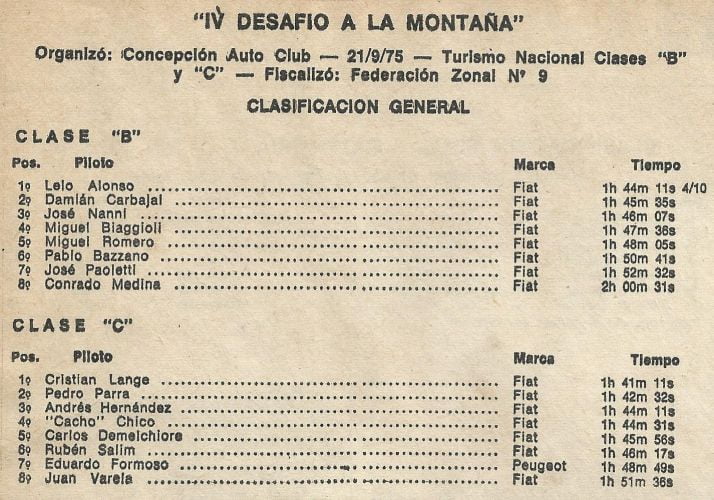 Una nueva fecha del Desafío de la Montaña hizo disputar el Concepción Auto Club para las categorías Turismo Nacional clases B y C, que daban puntos para el campeonato del NOA. Ocurrió en 1975 y fue la cuarta edición de la prueba. Aquella vez fueron 130 kilómetros a plena montaña, desde Iltico, sobre el puente del río Chirimayo hasta Las Estancias, de ida y vuelta. El ganador de la general fue Christian Lange, con una coupe Fiat 125 en la clase mayor, con un tiempo de 1h.41’11”.