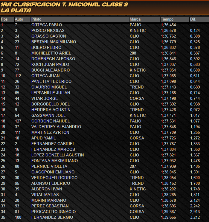 Gran jornada para tres, no tan buena para uno. En el autódromo “Roberto Mouras” de La Plata, la clasificación de la Clase 2 del Turismo Nacional dejó en lo más alto a Pablo Ortega y su Fiat Palio. En el top terminaron Maximiliano Bestani (4°) y Juan Ortega (10°). En cambio, a Matías Rodríguez lo chocaron y no registró tiempos. Estos tres últimos corren con Renault Cli