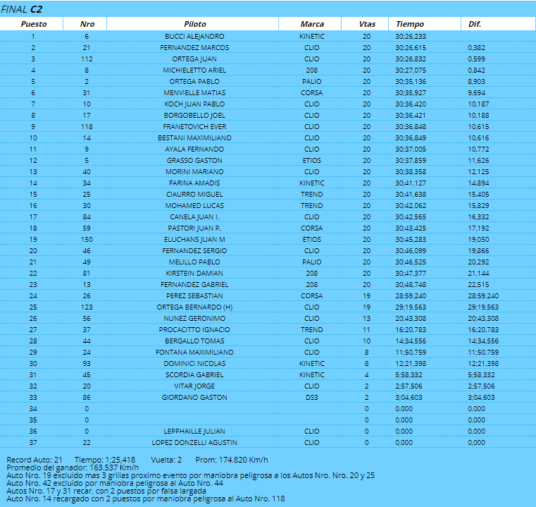 El único que no pudo arribar en zona de puntos fue Bernardo Ortega (h), que perdió rendimiento al final con su Clio, luego de hacer luchado bastante. Quedó clasificado 25°, a una vuelta del ganador.