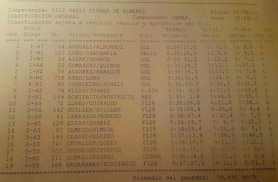 A Gastón le tocó abrir el camino y lo hizo de la mejor manera, sin cometer errores. En carrera, terminó capitalizando el abandono de su escolta en el campeonato Cristian Almonte y aguantando todos los embates de los chicos de la clase A-6, que hasta la prueba N° 3 peleaban al segundo la clasificación de la carrera. Con este triunfo Ahualli se consolida en lo que es su primer campeonato completo en el Provincial. Cuenta con la navegación del experimentado Mauro Albornoz.