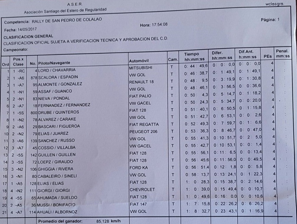 Otros vencedores de clase fueron Adrián Assaf (Gol N-1); Kamel Drube (Fiat 128 A-5s); Carlos Álvarez (Gol N-2) y Pablo Elías (Fiat 128 A-5). A continuación, los tiempos generales.