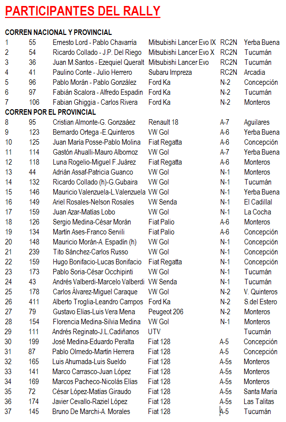 Serán 37 los pilotos que tomarán parte en Tafí del Valle de la fecha 1 del Campeonato Tucumano de Rally. La competencia, en su totalidad, se concretará el sábado.