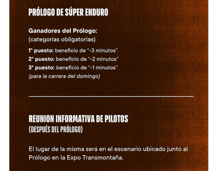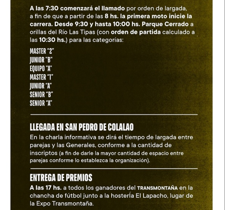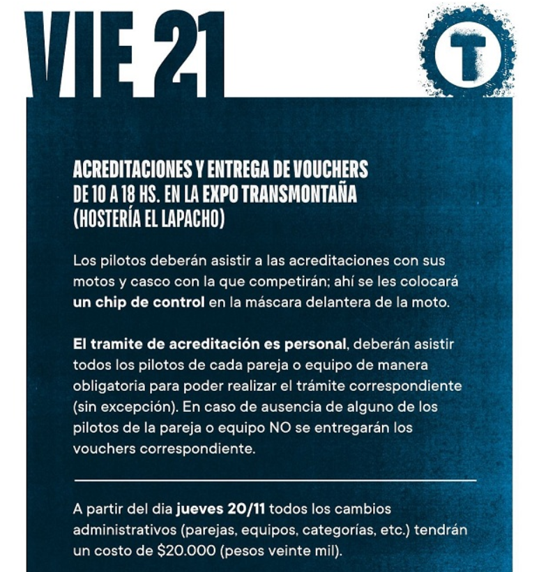 Lógicamente la competencia ya tiene definida su hoja de ruta, con horarios, requisitos y aspectos logísticos que deberán considerar los más de 600 pilotos inscriptos hasta el momento. La actividad oficial comenzará el viernes 21, día en que se realizarán las acreditaciones. Los competidores deberán presentarse en parejas o equipos, con sus motos y equipamiento, para validar su participación y retirar el material necesario. Este proceso continuará el sábado 22, fecha que además incluirá la apertura de los parques cerrados y el desarrollo del prólogo oficial, cuya premiación se llevará a cabo ese mismo día. La jornada cerrará con la charla obligatoria para pilotos, instancia en la que se brindarán las indicaciones finales de cara a la competencia principal del domingo 23, que concluirá con la ceremonia de premiación del Transmontaña y de la Copa Beta Enduro Classics Series a partir de las 17.