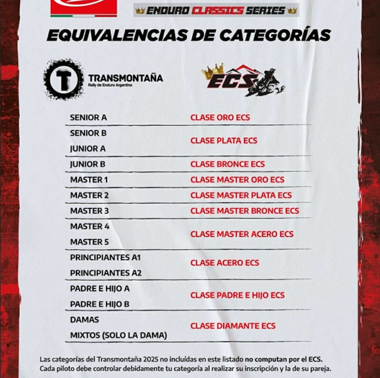 Vale recordar que esta competencia tendrá validez por el Campeonato Enduro Classics Series, que se esta manera pone punto a su temporada. A continuación, la equivalencia de categorías en competencia: